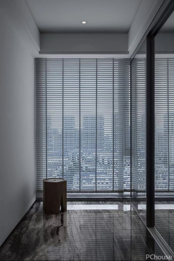 由于原结构的主卧空间较小,设计师通过格局的改造改变其原本的缺陷,设计师通过将主人起居的生活模式的设定来改善空间的关系及提高人的舒适度,通过反复的设定和模拟与沟通,最终将主卧室的洗漱间与马桶间功能区分开,并将洗漱功能设计在位于贯穿主卧进门空间的走廊的尽头,饱览高层城市的日日夜夜加上明亮的光线作为点缀,使得空间清新怡人、舒适减压。