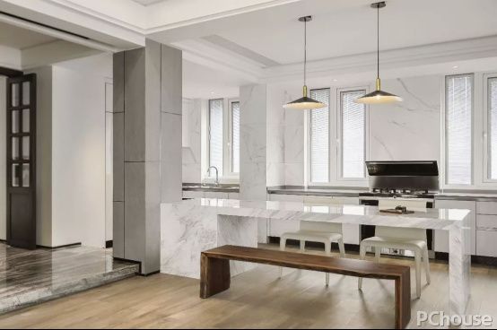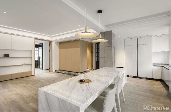 敞开式的厨房设计,改变原来厨房过小的缺点,并且延展后达到了更大空间范围的收纳。同时开放式的厨房连接餐厅与客厅的区域,将空间之间结合的同时促进家人之间的互动交流,而这一切都充分发挥了空间的功能。