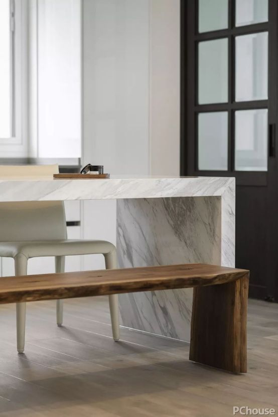 精心挑选的天然大理石台面作为餐桌功能与白色墙体形成一种厚重与轻盈之间的平衡美感,搭配用灰色水泥包裹的柱子和设计师专门为业主定制的木质长凳,这样的反差感增添了更多的“生活味道”,十分有趣,耐人寻味。又是一种相伴的模式,真好。