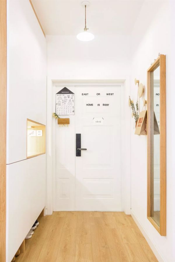 ▲设计师在餐厅和入户门之间做上一个到顶的鞋柜,打造出了一个小玄关走廊。鞋柜的底部和中间留空,搭配另一侧的穿衣镜和挂衣钩,非常实用。