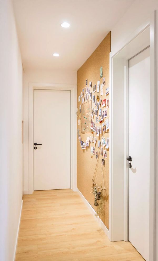 ▲很喜欢这个通往卧室的走廊过道的墙面设计,在墙面做上软木板,然后挂上一些照片和小饰品,可以给人带来一种温馨感。