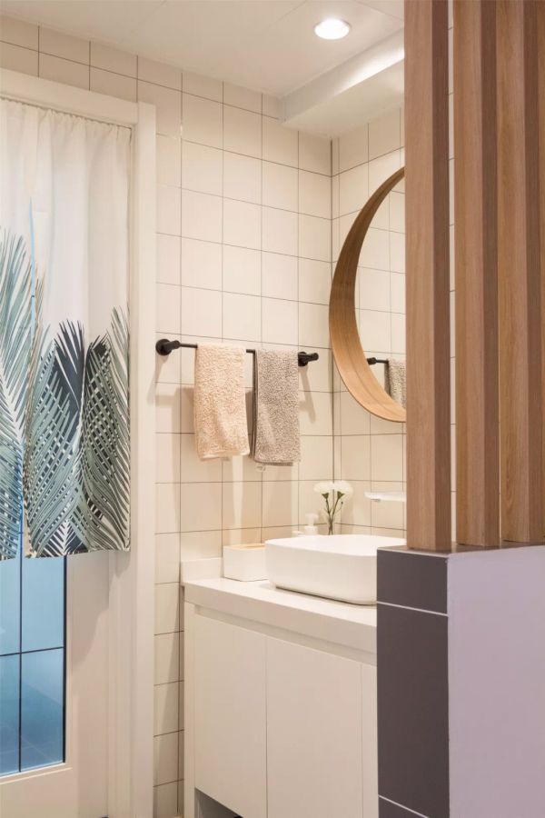 ▲公卫的洗手台是被放在了卫生间的门外,更方便平时使用。设计师在这里做了半墙加上木栅栏的隔断,让它多出一些隐私性,看起来更加美观。