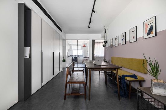 去掉繁重的布艺沙发和茶几,换成实木长桌,客厅就成了多功能空间,既是餐厅,也可以是会客区,还可以是办公区。多种需求,一个空间就能满足。