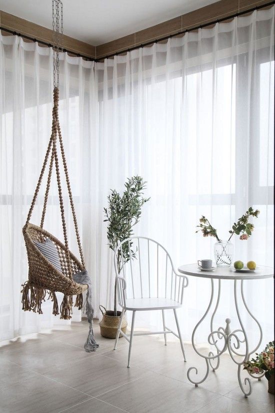 既然是休闲阳台,那当然不能少了极度舒适的吊椅。在阳台天花板上多打两个孔,休闲秋千立刻拥有。再布置一套小巧的咖啡桌椅,用几株绿植花卉做背景,小小的阳台就成了家里最美的画卷。宅家时坐在这里泡上一杯咖啡,静静地看着窗外的景致,烦躁的思绪也能放松许多。