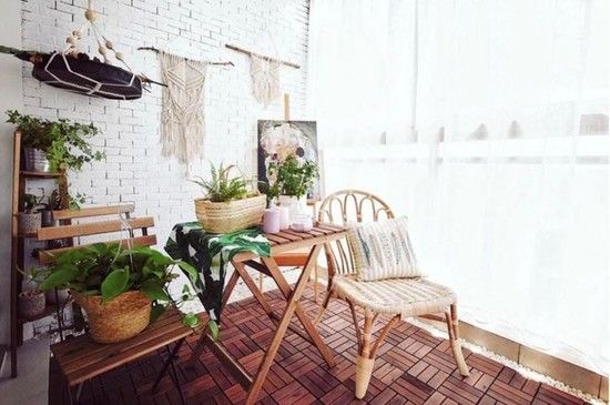 吊兰盆栽、编织挂饰、折叠木桌椅,这样的搭配和上面的“咖啡桌+吊椅”相比,又多了几分美式乡村的味道,让阳台活生生地变成一个别致又自然的小花园。折叠桌不用的时候还可以收起来,节省空间,非常适合家里阳台空间不太宽敞的小伙伴。