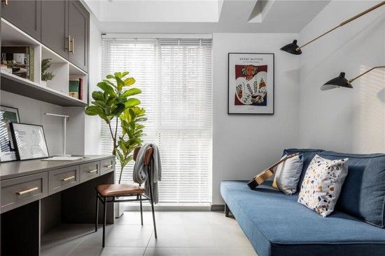 家里有书房,但空间狭长,现有布局不合理导致采光太差,书房功能形如虚设,该怎么办?首先,改变布局,把书架和办公桌都靠墙放置,留出中间空间。第二步,把窗帘换成风琴帘,既能保证室内光线充足,又能让照射进来的光线更加柔和,不影响工作。别忘了,书房不大,书柜等家具最好选择百搭的白色,营造空间的宽敞感。