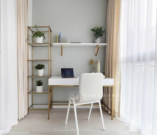 让家多出一间书房还有第二种办法——把书房搬进阳台里。书桌靠墙摆放,墙上安装置物架,收纳书籍、工作时用到的文件等,让工作桌面保持整洁。一旁布置几盆绿植,瘦身版的书房就更有生机啦,工作间隙看看绿色也很养眼。