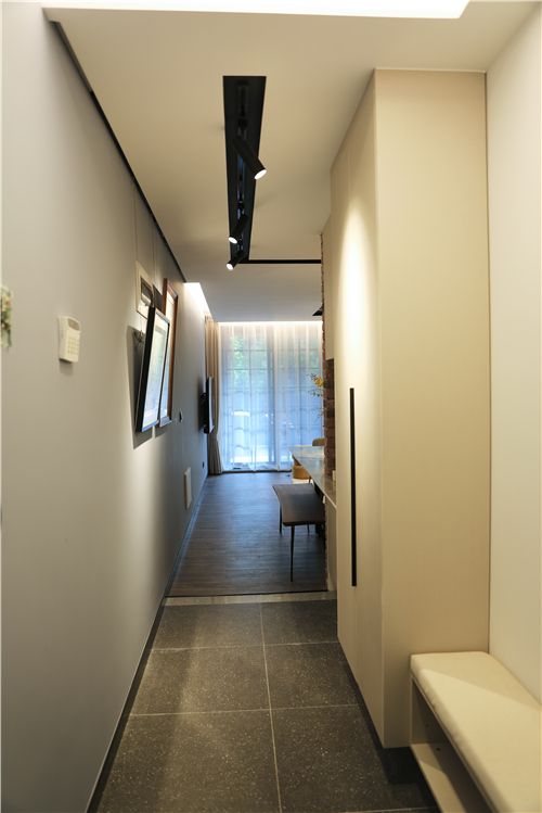 在设计选材中,考虑居住环境为潮湿水多的一楼,我们选择了仿水磨石花纹的深灰色瓷砖,在控制预算的同时以餐桌位置为界限划分出玄关与室内的位置,抬高玄关柜体下侧20公分用于室外鞋放置,在清扫和多人入户中提供方便。