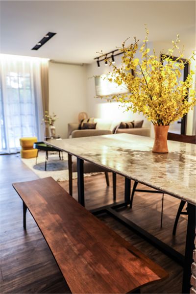 从无处安放的餐桌,到整屋动线的核心,餐厅无论是作为美食饱腹或是文化交流都提供非常重要场所的作用,为餐桌三边留出最少1米的动线空间,同时,也满足业主喜欢三五好友来餐聚的习惯。我们选用意大利灰大理石作为餐桌定制了适合空间最大尺寸的台面,最大可提供6人聚餐小酌。无论是餐盘众多的西餐,还是碗碟重重热气腾腾的火锅,都能轻松摆放。