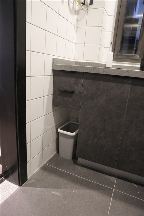 厨房中我们特别为垃圾桶找了一个“家”,在管道井占用的30公分柜体内,我们在柜体下留出了垃圾桶的摆放位置,充分利用了小空间,在厨房来回走动的操作中,保证安全和清洁。