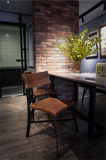 餐边柜作为餐厅中的收纳用具,不仅可以完成简单的早餐,也可以收纳常用的干货零食,调羹和餐具。餐桌台面同时延伸至玄关台面,一物多用,不仅节约预算,也使得不大的空间更加整体性,配合3000K的窄束脚筒灯,粗糙的红砖墙面在灯光中留下时间的痕迹。酒杯中你回到了儿时的弄堂里,还是去到了机器轰鸣的工厂栅栏外?