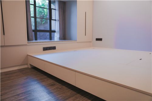 如果不是打开衣柜的门(请详见视频),你能想到顶、地梁被藏在其中吗?米白色的榻榻米和衣柜,用色彩扩大了主卧面积,设计中我们不放过一点收纳的可能性,窗台改造的小桌台在窗帘下方下陷2公分遮光。榻榻米四周的掀板和抽屉都可以用来分别放置不同种类和季节的衣物用品。设计师贴心的将抽屉下沿抬高8公分,免去会磕碰的拉手,也为拖鞋收纳放置找好了位置。增加更多的储物收纳空间,也减少了后期采购软装的费用。只需要一张床垫,就可以啦!