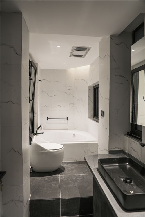延续客餐厅的整体氛围,采用了深灰色浅凹凸感的亚光面瓷砖,在厨房与卫生间大量使用,增加防滑效果也方便清洗打理,卫浴五金和厨房五金,黑色磨砂手感在水渍较多的空间更不易留下痕迹,也在白色系的墙面砖背景中,点缀出设计者重视生活品质的设计追求。卫生间设计订做的镜柜让台面的清洁更方便,台盆柜下预留的脏衣篮收纳区,也使得狭长的卫生间更少一些磕碰。