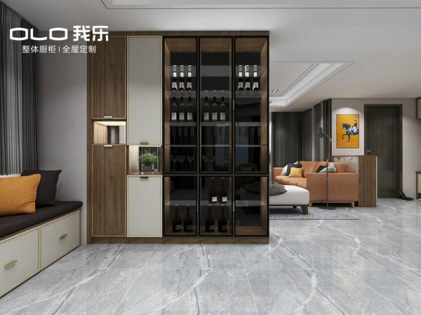 另一方面,巧妙利用定制橱柜升级客厅的收纳。定制柜体兼任橱柜与餐边柜功能,同时合理设计柜体形式。一部分承担储物功能,另一部分作为红酒展示区,生活情趣就此凸显。