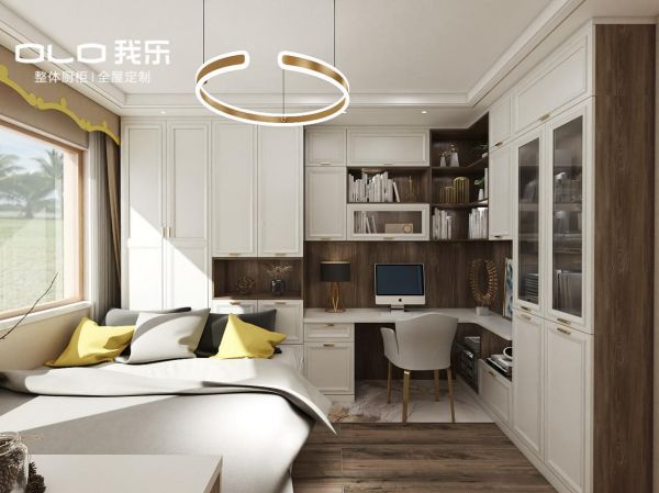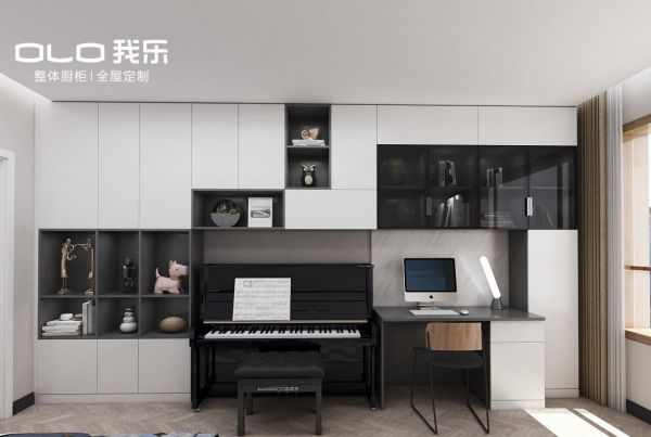 书桌嵌入到书柜中很省空间,书柜可以设计成自己喜欢的组合,个性十足。电脑桌与书柜一体设计,形成书桌柜,还能做娱乐室,满足乐曲、书法、绘画、创作、摄影、喝茶、游戏等需求,很实用。