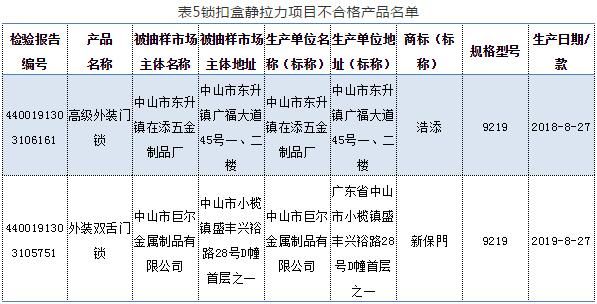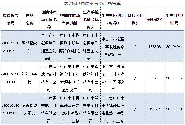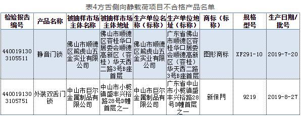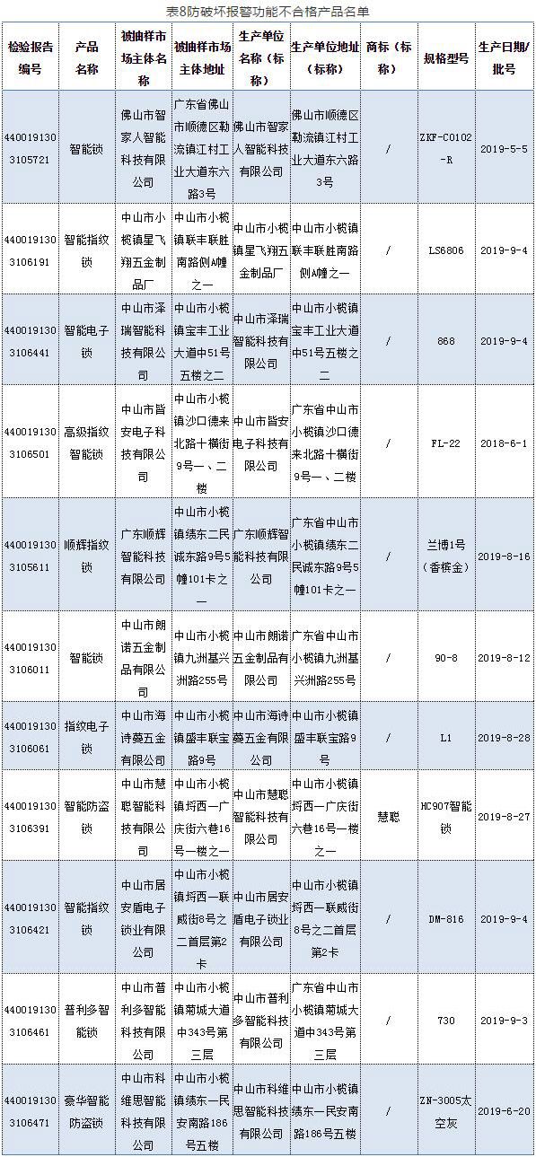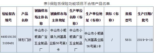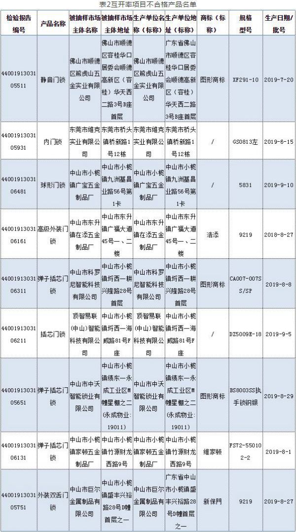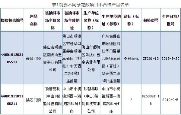 2020年5月9日,广东省市场监督管理局网站发布《关于2019年度广东省锁具产品质量监督抽查情况的通告》。据通告,本次抽检任务由广东省中山市质量计量监督检测所承担。共抽查91家企业生产的100款锁具,经检验,发现20家企业生产的20款产品不合格。不合格项目主要有:钥匙不同牙花数、互开率、保险锁舌保险功能、方舌侧向静载荷、锁扣盒静拉力、绝缘电阻、抗电强度、防破坏报警功能等。