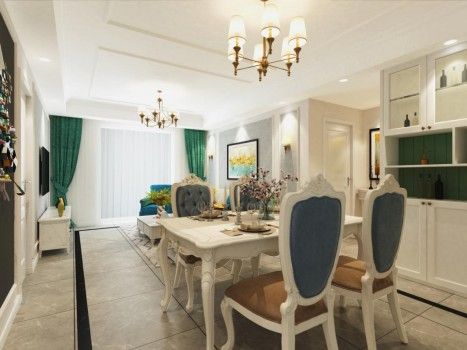 主卧门口放装修端景柜,配一幅装饰画,让过道不显得单调,餐厅酒柜挡住客卫门洞,进出卫生间也不显得尴尬。入户旁边墙上挂上试衣镜,出门前整理漂亮妆容。