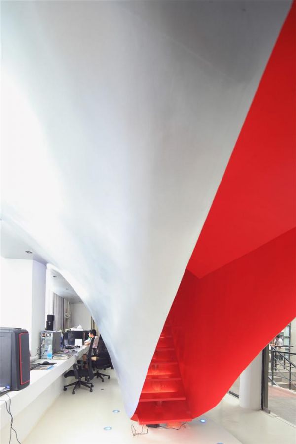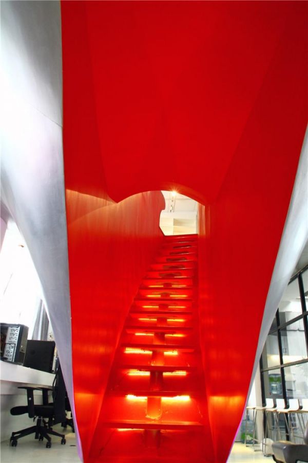 在较低的楼层,各个工作站沿着窗户放置。绿色雕塑桌可用于公共活动。中央楼梯既非正式又有轮廓,让人想起准备从天花板上掉下来的大水滴。进入楼梯后,明亮的红色高度饱和的环境吞没并围绕着个体,鲜明地标志着对比办公室区域之间的过渡。颜色在第二层重复出现,以突出凹进的工作区域。