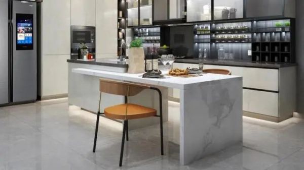 明亮质感的汉白玉大面积使用,给人洁净高端的感觉。岛台设计延伸厨房空间,烹饪时可与家人随时互动,尽享温馨时刻。食品级操作台面和涡轮动态杀菌智能技术的融入,长久守护家人健康。