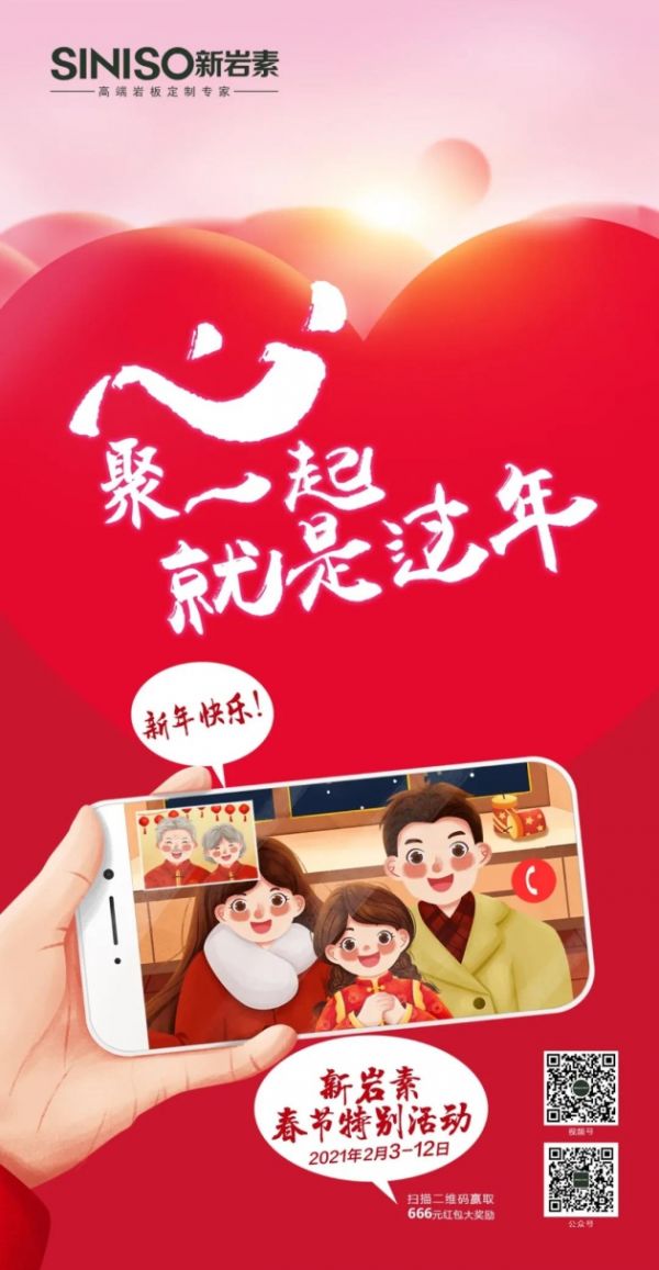 即日起,关注新岩素(新飓)公众号、视频号,参与新岩素“心聚一起,就是过年”春节活动,将有机会获得超大现金红包、精美礼品,2021年的锦鲤就是你!