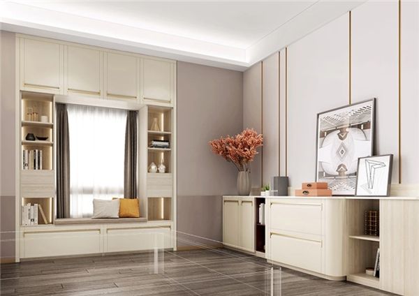 艾菲尔系列飘窗柜依墙而设,窗户两边设计为开放式置物格,摆放书籍、装饰物,集收纳和展示于一体,窗户上方打造为大容量的储物柜,增加卧室收纳空间,换季的被褥、床垫都能收入其中。收纳功能强大的艾菲尔系列飘窗柜,还拥有很高的颜值,月牙白的门板、金色线条和白色窗纱相得益彰,完美地和飘窗融为一体,轻松就能为卧室营造优雅的氛围。
