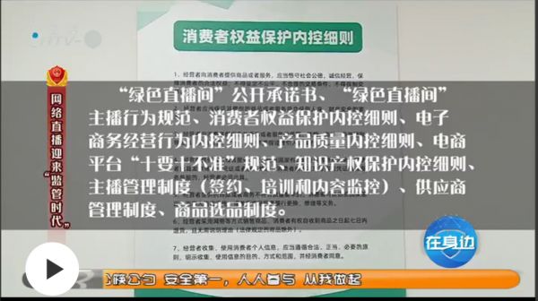 走进老爸评测直播间,第一眼就能看到“绿色直播间”特有的标识,形象生动,涵义丰富。此外,周围墙面上悬挂着“绿色直播间”公开承诺书、“绿色直播间”主播行为规范、消费者权益保护内容细则、电子商务经营行为内控细则、产品质量内控细则、电商平台“十要十不准”规范、知识产权保护内控细则、主播管理制度(签约、培训和内容监控)、供应商管理制度,商品选品制度等内容铭牌。