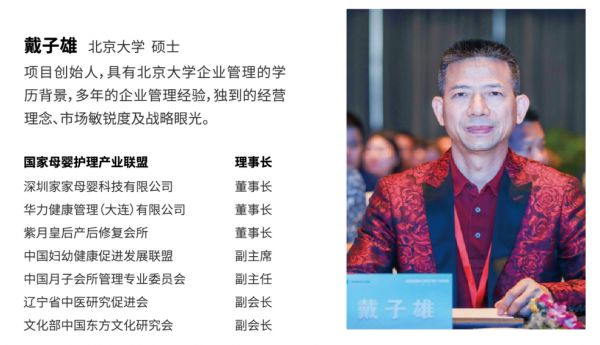 作为一个男人,之所以会想到创办母婴会所,是因为早年在工作中接触到很多母婴家庭,因为某些月子陋习,不但未能很好的调理产后妈妈的身体健康,反而极大的损害和身体健康,甚至带来生命不可承受之重。有鉴于此,针对女性产后身体修复、健康护理、心理疏导等问题,戴子雄先生先后创立月子皇后月子会所、紫月皇后产后修复中心,家家美妈智慧到家产后修复平台,以及全国首家母婴服务O2O平台。秉承“关爱母婴的健康与幸福”的使命和“向客户奉上我们发自心底的健康关怀”的服务宗旨,希望每一个产后妈妈都能够享受到家家母婴健康科学、专业细致、爱心周到的母婴护理服务和人性呵护!不在发生生命不可承受之重!