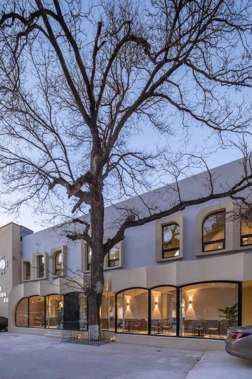 " 2020年夏天,一个朋友找到我们,他选好了一处地点,想做一个餐厅,把湖南老家的土火锅介绍到北京来。餐厅的地点位于北京东城区和平里航星园,二环往北一点点,在一个办公和老旧小区混杂的大院里。原来的空间是一个闲置的库房,一层多柱,二层较高,空间的南北两侧有着致密的片墙和大窗户,南侧的窗外有一棵老槐树。"______建筑师唐康硕