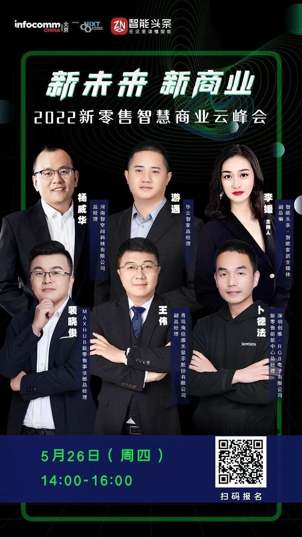 新浪家居智能家居频道讯 5月26日,以“新商业,新未来”为主题的2022新零售智慧商业云峰会即将举办!本次线上峰会由智能头条•智能家居全媒体与北京InfoComm China特别共同举办特邀来自海信、MAXHUB、创维、华云智家、河南智空间的等五位行业专家,围绕现阶段企业新零售发展格局、数字技术催生的新型营销模式及需求端的创新服务升级等问题展开集中探讨。同时,海信、MAXHUB及创维等品牌厂商也将带来最新的新零售方案展示,提供最佳实践范例。