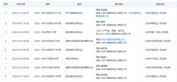 近日,天眼查官网显示,北京今朝装饰设计有限公司新增1则开庭公告,案号为(2022)京0108民初29117号,案由为财产损害赔偿纠纷。案被上诉人/被告为北京今朝装饰设计有限公司、北京海房物业管理有限公司;由北京市海淀区人民法院复兴第三十九法庭审理,开庭时间为2022年11月18日。天眼查显示,2022开年截止目前,北京今朝装饰设计有限公司涉及诉讼案件,已有8则开庭。