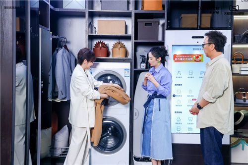 体验完新一代厨房,丁丁张提出高端面料难以护理的问题,而方龄现场为她们推荐了卡萨帝洗衣机。三人走进衣帽间,高叶将一件羊毛面料的衣物放进洗衣机后,通过“养护空气洗”的护理很快恢复了柔顺质感和最初色彩。“被安利到了,这个功能不错,还不用水洗!”对于经常换装、出席活动的高叶来说,高端面料衣物多、换衣勤,而卡萨帝洗衣机能让她轻松拥有精致生活。