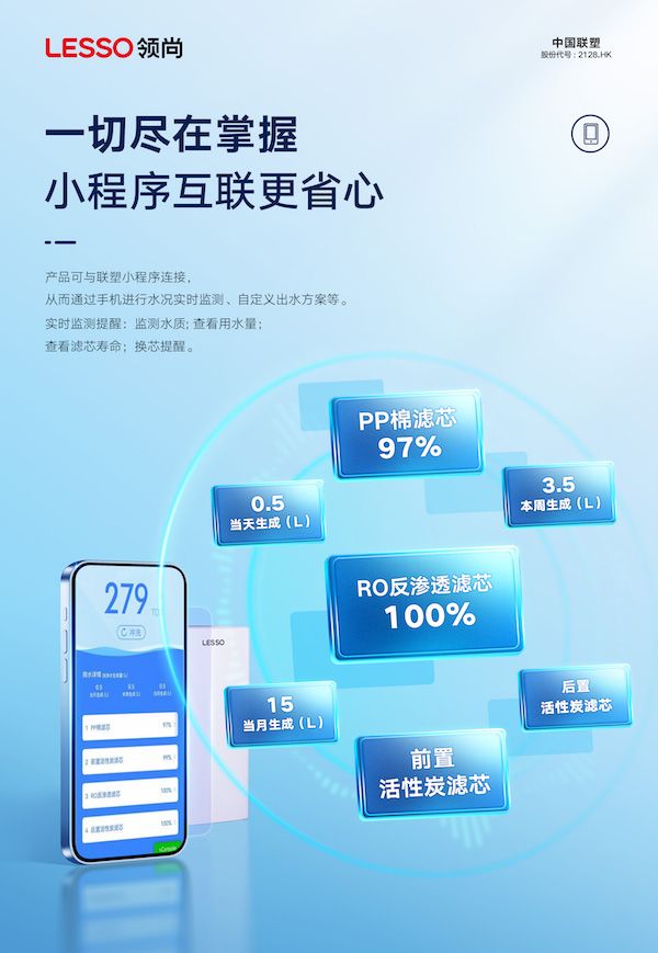 智能互联,通过手机轻松查看家庭各项用水情况,水质指标及滤芯使用情况,各项数据一目了然。