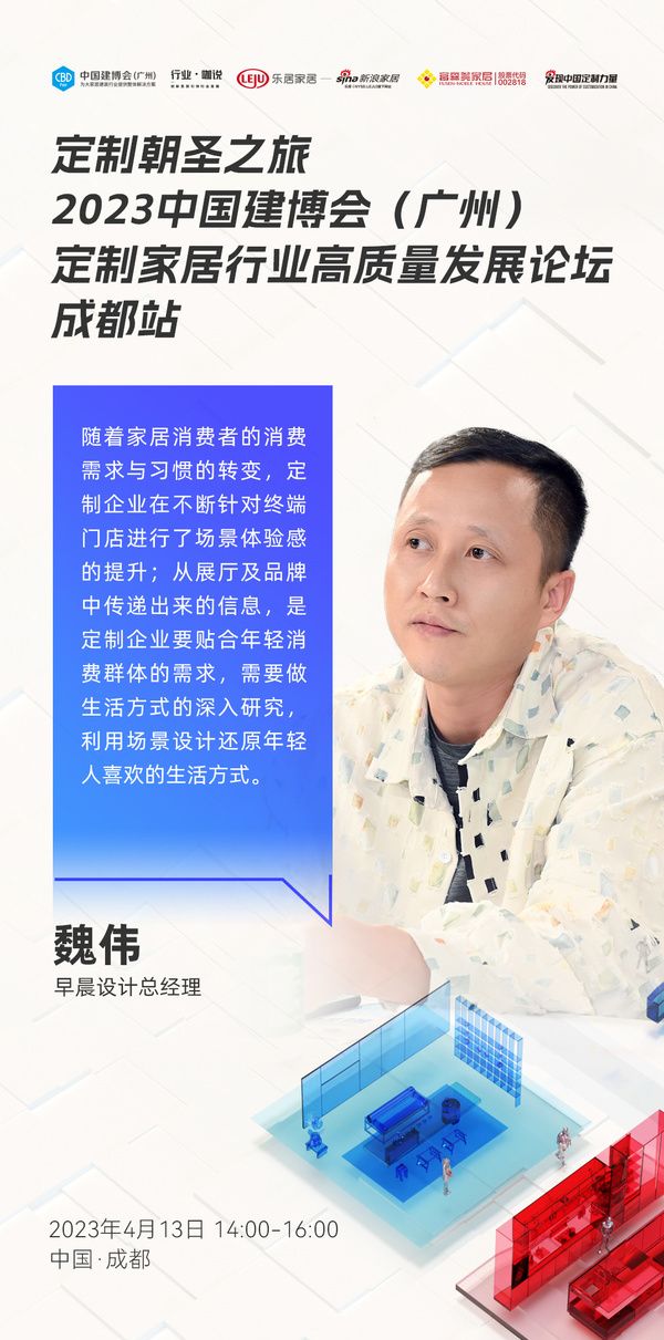早晨设计总经理魏伟:随着家居消费者的消费需求与习惯的转变,定制企业在不断针对终端门店进行了场景体验感的提升;从展厅及品牌中传递出来的信息,是定制企业要贴合年轻消费群体的需求,需要做生活方式的深入研究,利用场景设计还原年轻人喜欢的生活方式。