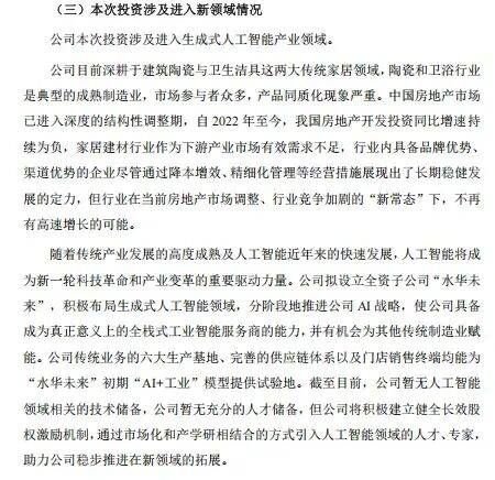 此前,帝欧水华发布公告称,公司拟使用自有及自筹资金5亿元设立全资子公司水华未来科技有限公司,以拓展生成式人工智能领域相关业务。该笔投资将分步实施,并于5年内完成实缴。