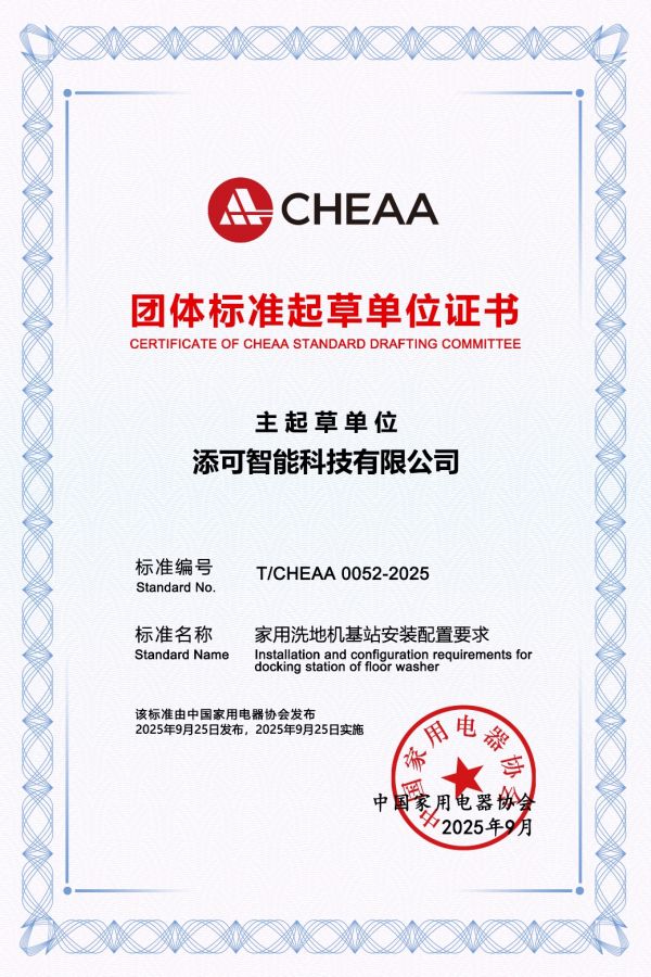 为了让更多追求品质生活与清洁体验的用户从中受益,也为了推动家电家居一体化建设,添可选择为行业填补空白,主导制定并发布了《家用洗地机基站安装配置要求》标准。事实上,这已是添可第四次参与主导制定的行业标准,再次彰显了其作为“标准制定者”的行业领导力与责任担当。