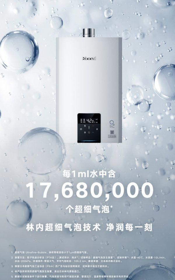 此次荣膺红顶奖的氧霂Plus系列零冷水热水器,搭载林内自研的微纳活氧2.0技术,可在每毫升水中生成约17,680,000个直径小于1微米的超细气泡(数据来源:日本林内株式会社,数据在试验室条件下进行测量,气泡浓度与粒径可能因水源、管道压力、温度等现场环境因素而有所浮动)。这项技术在实际应用中,能够利用气泡表面的电荷带走油脂、细菌等杂质,与普通热水相比清洁能力更强:在厨房场景,超细气泡能有效去除果蔬细菌与洗涤剂残留,以及餐具上的油渍;在沐浴场景,超细气泡能滋润毛孔同时高效洗净肌肤油脂,令肌肤更细腻净透。
