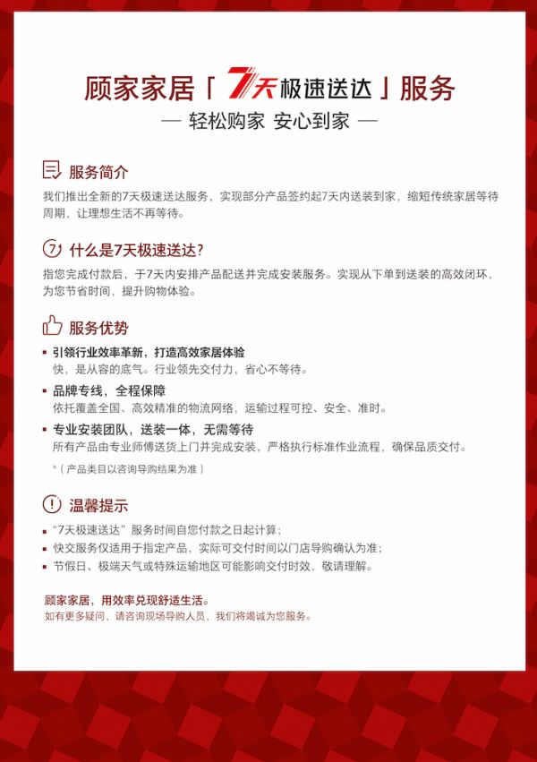 “快”,体现在对交付时间的明确保障。活动承诺所购商品“春节前送达”,消除消费者对节日期间无法收货的担忧。此外,针对部分现货商品,顾家提供“7天极速送达”服务,为有紧急需求的顾客提供更快捷的选择。